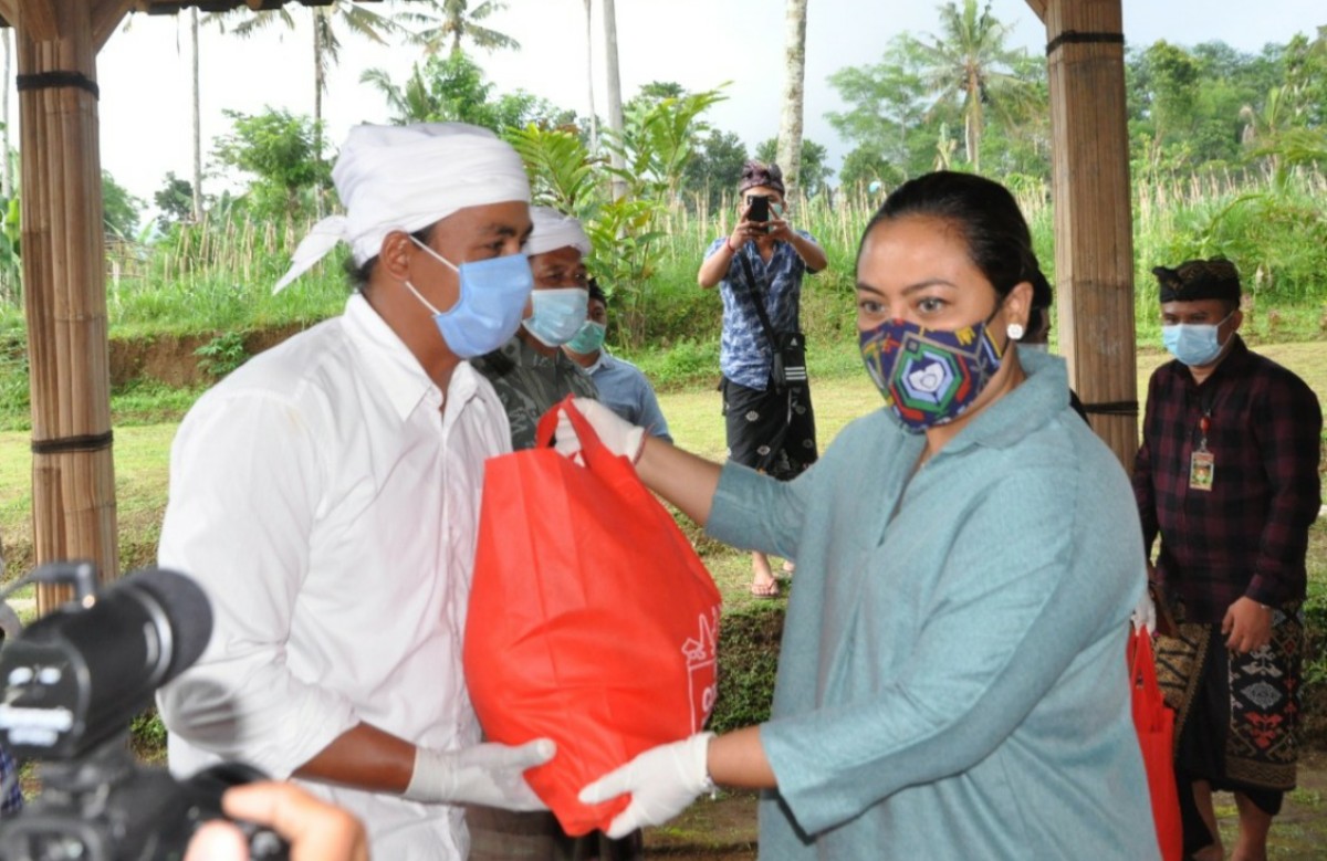 TABANAN – Pantaubali.com – Bupati Tabanan Ni Putu Eka Wiryastuti menyerahkan bantuan kepada Pemangku dan Pasutri Desa Angseri yang terdampak pandemic Covid-19. Penyerahan bantuan dilakukan secara simbolis di Yayasan Bali Mepantigan Arts Kebun Putu, Banjar Angseri, Desa Angseri, Baturiti, Tabanan, Kamis (22/10).