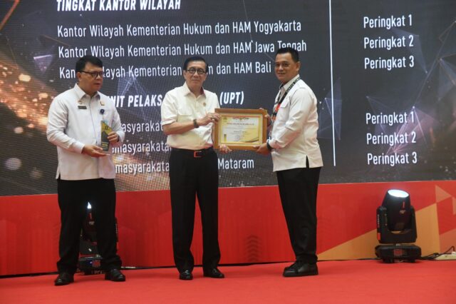 Penghargaan diberikan langsung oleh Menteri Hukum dan Hak Asasi Manusia, Yasonna H. Laoly kepada Kepala Kantor Wilayah Kementerian Hukum dan Hak Asasi Manusia Bali, Romi Yudianto pada kegiatan Refleksi Akhir Kementerian Hukum dan HAM Tahun 2023, bertempat di Hotel Borobudur, Jakarta, Kamis (14/12/2023) kemarin.